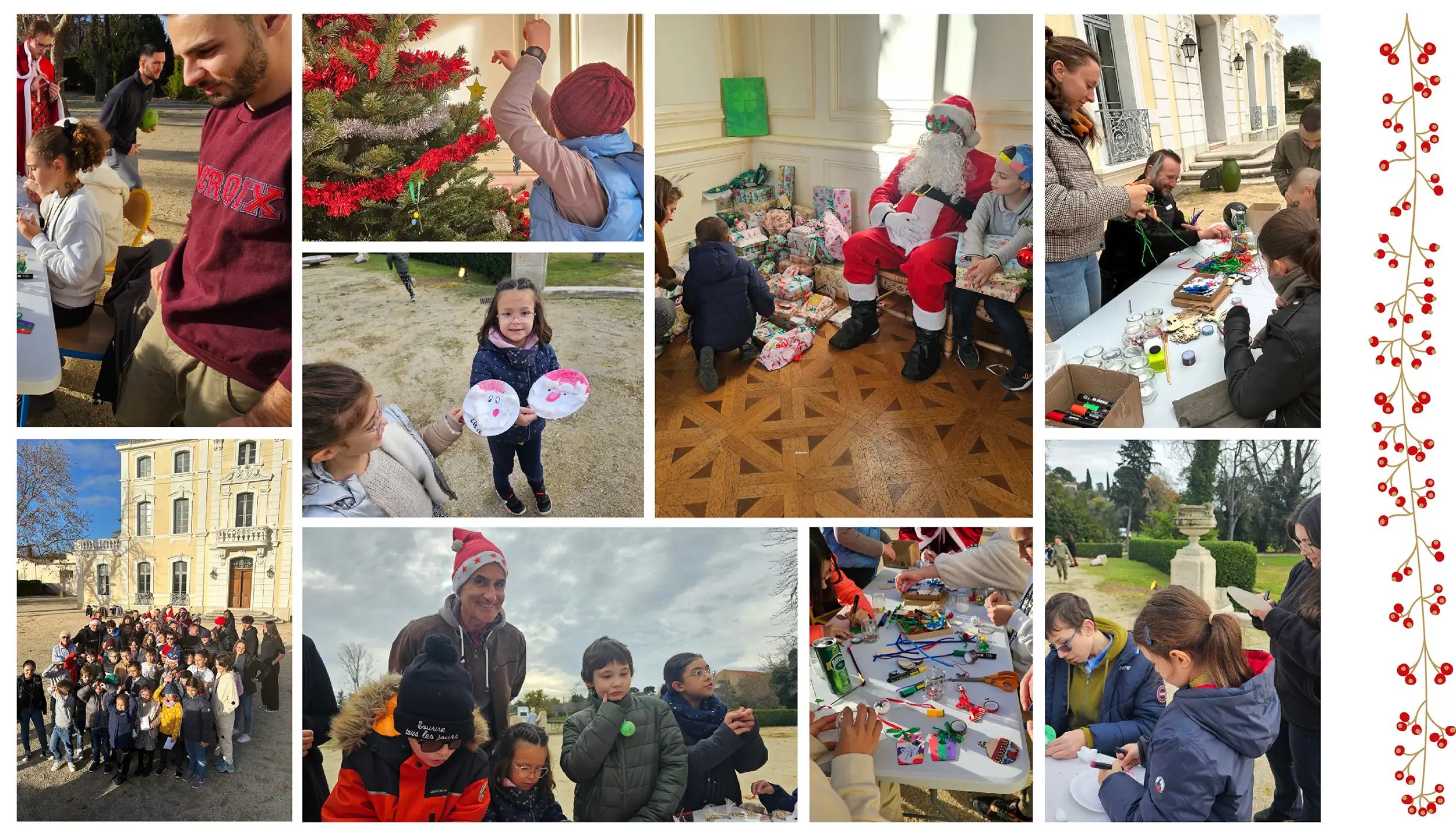 • Creative activities: decorating ornaments, creating small reindeer with pebbles, and crafting Santa Claus figures with cardboard plates.